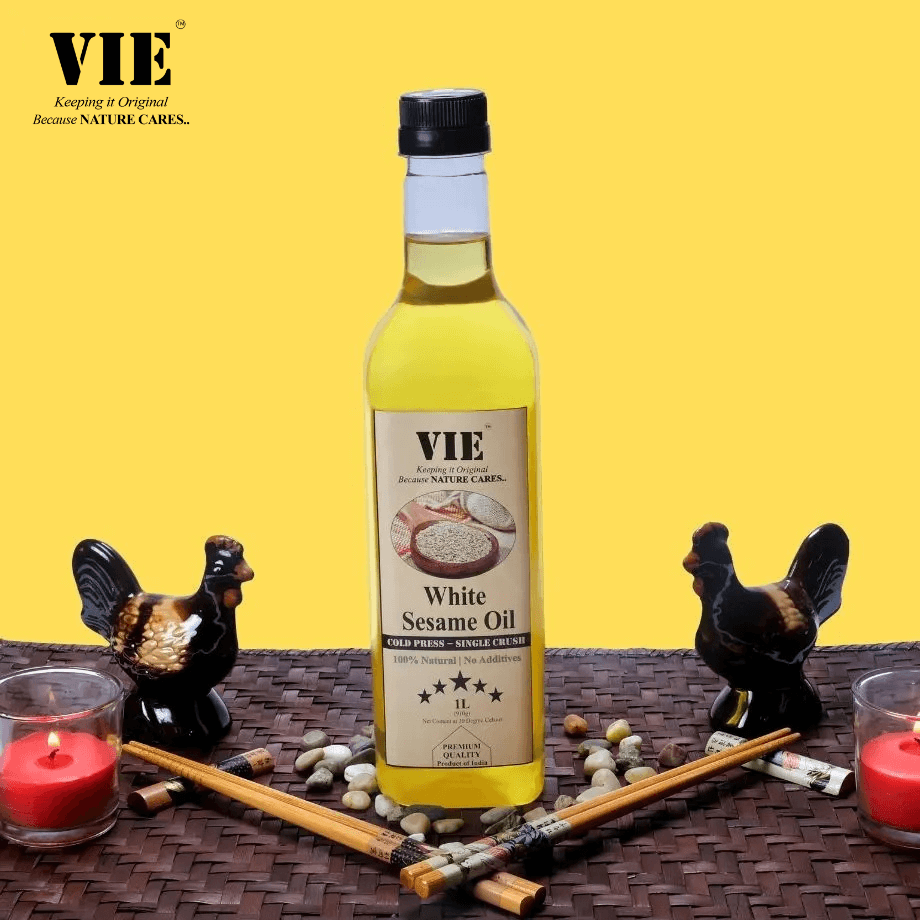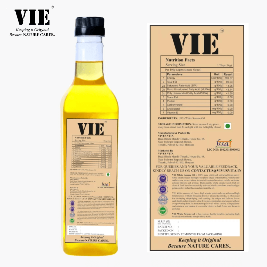 VIE White Sesame Oil is 100% pure edible oil, extracted from purely white sesame seeds through cold press-single crush method, without any additives or preservatives, to retain its natural nutrients, subtle nuttiness, delicate flavors and aromas. High-quality white sesame seeds that are clean & fresh have been carefully selected which contribute to a clear light golden color, richer flavor and aroma in the oil.